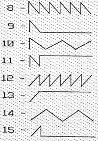Eine gesetzte Null bedeutet: dieser Kanal erhĂ€lt das Volumen ĂŒber den letzten SOUND-Befehl, eine Eins bedeutet, daĂ die LautstĂ€rke ĂŒber die HĂŒllkurvenform geregelt wird. Wie aus der Tabelle ersichtlich, liegen die Werte zwischen 0 und 7. Der Parameter âHĂŒllkurvenformâ bestimmt eine Form, nach der die LautstĂ€rke vom IC geregelt wird. Dies ist eine 4-stellige Dualzahl, wobei jedes Bit fĂŒr Continue, Attack, Alternate und Hold zustĂ€ndig ist. Damit ist der Wertebereich auf 0 bis 15 beschrĂ€nkt. Allerdings ergibt nicht jede Zahl eine sinnvolle HĂŒllkurvenform. Der sinnvolle Bereich liegt von 8 bis 15.