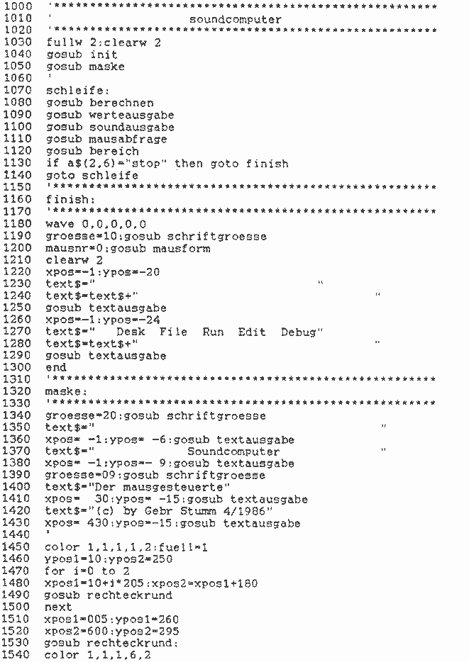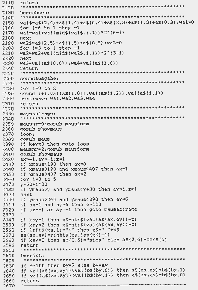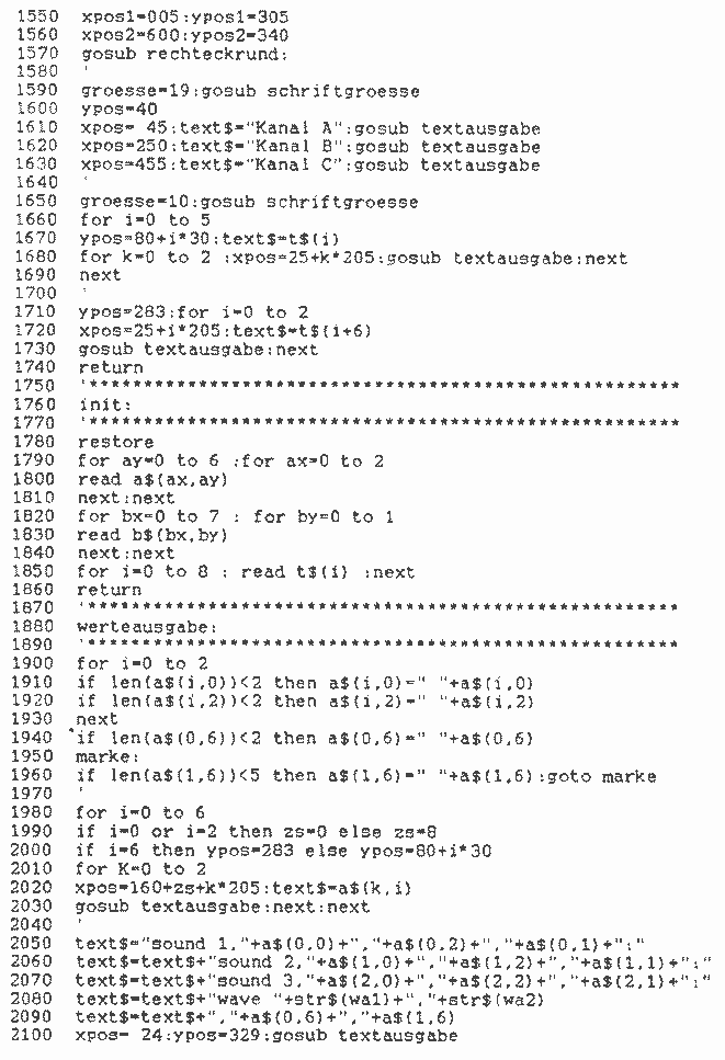 Nachdem Sie das Programm hoffentlich fehlerfrei eingetippt haben, sollten Sie es erst einmal speichern, da falsche POKE-Anweisungen schnell zu einem Absturz fĂŒhren können. Danach kann man es mit RUN starten. Es sollte nun ein Bildschirmaufbau wie in der Abb. zu sehen sein. FĂŒr jeden Kanal existiert eigens ein Einstellfeld. Durch Anklicken des jeweiligen Begriffes wird sich dieser Ă€ndern. Klicken Sie mit der linken Taste, so wird die Zahl des zugehörigen Begriffes erniedrigt, mit der rechten um eins addiert. Die HĂŒllkurvenform und die Periodendauer gelten fĂŒr alle drei KanĂ€le, somit stehen sie in einem gesonderten Kasten. Da die Periode einen relativ groĂen Bereich mit ihren Zahlen abdeckt, habe ich mich entschlossen, hier den Faktor 100 fĂŒr das Andern zu nehmen. Um das Programm zu verlassen, mĂŒssen beide Maustasten gleichzeitig betĂ€tigt werden. Hierbei muĂ der Mauszeiger natĂŒrlich auf âProgrammendeâ stehen.