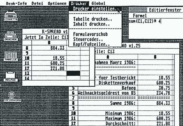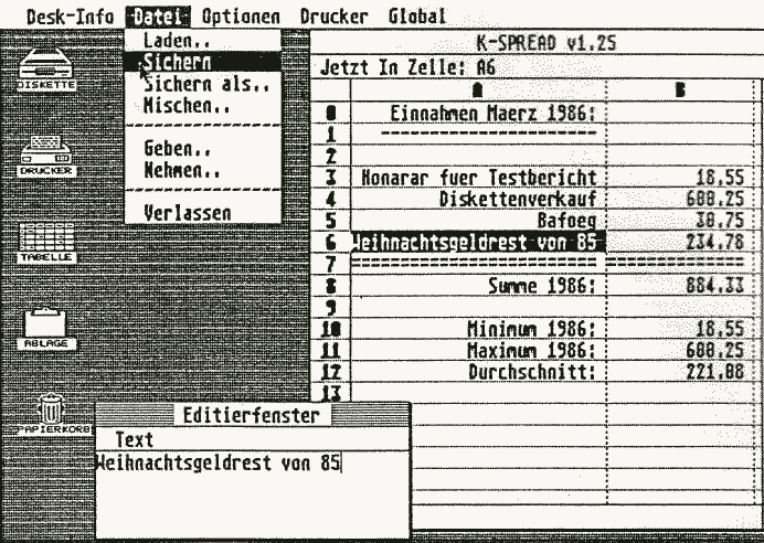 Mit Hilfe eines (verschiebbaren) Editierfensters können in die einzelnen Tabellenfelder („Zellen“) Zahlen, Formeln oder Texte eingetragen werden (Abb. 1). Die Zellen sind in der Breite variierbar, Spalten und Zeilen lassen sich grundsätzlich einfügen oder löschen, Zahlenkolonnen können innerhalb der Tabelle beliebig hin und her kopiert werden. Die jeweiligen „Icons“ (Diskette, Tabelle, Ablage, Drucker, Papierkorb) oder aber die entsprechenden Einträge der Menüleiste können mit der Maus direkt zum Speichern, Drucken, Zwischenlagern, Kopieren, Löschen etc. herangezogen werden. Aufrufbare Zwischentexte geben Auskunft über den Status der jeweiligen Zelle, warnen vor Überschreibungen oder unzulässigen Kopierbefehlen. Zahlen und/oder Texte können rechts-, mitten-, oder linksbündig eingetragen werden. Dateien können von Diskette geladen werden, wobei auch mehrere Dateien nebeneinander auf das „Arbeitsblatt“ (Spreadsheet), zum beliebigen Mischen und Bearbeiten, geladen werden können. Dies geht „spielend“ vonstatten, bei freier Wahl von Texten oder Zahlen. Leider beherrscht auch die deutsche Version des Programms keine deutschen Umlaute. Ein Nachteil, der mir bei einem Tabellenprogramm allerdings verschmerzbar erscheint.