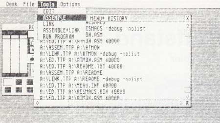 Auch im Metacomco-Assembler-Entwicklungspaket ist ein solches Programm namens "Menu + " (Bild 1) enthalten. Interessant an diesem Programm ist, daß die letzten 50 Programmaufrufe in einem Fenster dokumentiert werden und zur wiederholten Ausführung dort einfach anklickbar sind. Positiv fiel auch Menü + s freie Konfigurierbarkeit auf, d. h. es können beliebige Programme integriert werden. Wenn Sie außer in Assembler auch in 'C' programmieren, kann z. B. der Compiler-Aufruf in das "Tools"-Menü eingebunden werden.