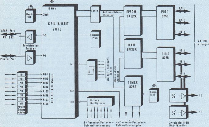 Die Karte beinhaltet eine 8 Bit-Hochleistungs-CPU (CPU-7810), 8 bis 32 K EPROM, 8 bis 32 K RAM sowie eine Vielzahl analoger und digitaler Schnittstellen. Über einen BUS-Stecker kann die Karte fast beliebig erweitert werden. Die Verbindung mit dem HOST-Rechner (in diesem Fall ATARI-ST) oder einem Terminal erfolgt über eine der beiden RS-232 Schnittstellen. Außerdem kann die Karte unabhängig vom Rechner funktionieren, sozusagen als Stand-Alone Gerät arbeiten. Damit wird die dezentrale Datenerfassung über große Entfernung möglich. Bis zu acht analoge Eingangssignale mit einer Auflösung von 8 Bit können erfaßt werden, wobei jeder Kanal über eine eigene Schutzbeschaltung, Filterung und Spannungstellung verfügt. Für die digitale Ein/Ausgabe stehen 48 I/O-Leistungen zur Verfügung, die in Gruppen von 8 bzw. 4 Bit individuell als Eingang oder Ausgang definiert werden können. Für die Erfassung von Frequenz, Periodendauer, Tastverhältnis oder Phase stehen 8 Eingänge zur Verfügung, die mit einer Auflösung von 32 Bit (9 1/2 Dekaden) arbeiten. Ferner läßt sich die Torzeit für jeden Kanal vorwählen. Für Probleme, die sehr zeitkritisch sind, steht dem Anwender eine integrierte, ungepufferte Echtzeituhr zur Verfügung. Das im ROM mitgelieferte Betriebssystem ermöglicht über ein eingebautes DOWN-LOAD Programm, daß zukünftige Erweiterungen oder Anwenderwünsche einfach über die V24-Schnittstelle ins RAM gebootet werden können.
