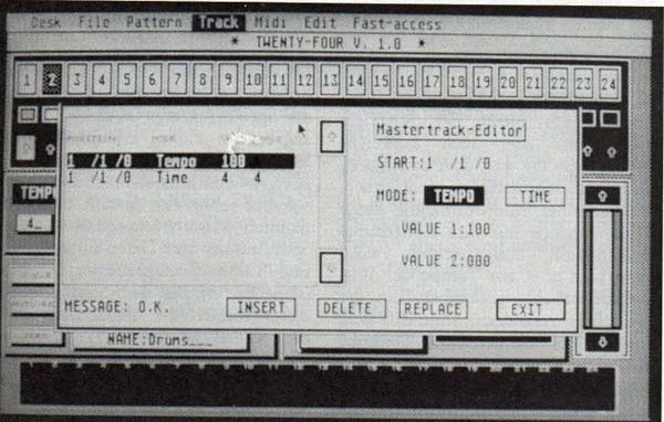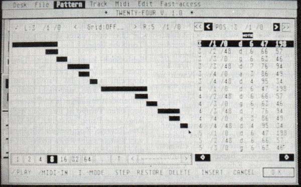 Das Steinberg Twentyfour ist also ein Programm, das den ST in einen solchen Sequencer verwandelt. Wie der Name des Programms schon sagt, handelt es sich hierbei um einen Sequencer mit 24 Spuren, das heiĂt, man kann maximal 24 polyphone Spuren nacheinander aufnehmen und dann zusammen wieder abspielen.