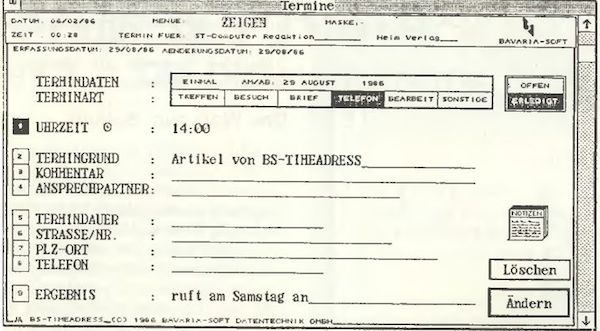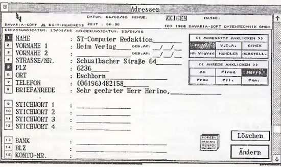 Die Softwarefirma BAVARIA SOFT aus Bayern hatte sich als neuer Softwareanbieter für den ATARI ST schon mit ihrem ersten Produkt BS-HANDEL auf dem ST-Markt etabliert. Mit Spannung erwartete man nun das bereits angekündigte Softwarepaket BS-TIMEADRESS.