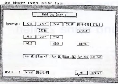 Eine Besonderheit des AuswahlmenĂŒs stellt der Modus â68 000â dar. Diese Betriebsart erlaubt es, nur die geraden oder ungeraden Adressen einer Datei einzuladen bzw. abzuspeichern. Dadurch können 68000er Programme in die zwei nötigen EPROMs programmiert werden. Diese Betriebsart ist auch beim ATARI ST anzuwenden, um ein Programm in das Low- und High-Byte-EPROM zu unterteilen.