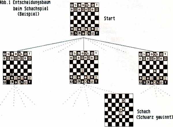 Am eindrucksvollsten ist der Fortschritt in der KI sicherlich im Bereich des Schachspiels. Es muß aber ausdrücklich darauf hingewiesen werden, daß im Verlauf der Entwicklung von Schachprogrammen ein radikales Umdenken erforderlich war. Erste Programme versuchten, das Spiel mit roher Gewalt zu gewinnen. Dazu mußte der Computer einfach die sich im Verlauf des Spiels ergebenden Entscheidungsbäume soweit wie möglich im voraus berechnen (Abb. 1). Man ging davon aus, daß höhere Rechenleistung und Speicherkapazität zusammen mit optimierten Such- und Sortieralgorithmen zu der gewünschten Schachleistung führen würden. Daß diese Erwartungen zutiefst enttäuscht wurden, liegt an einem Effekt mit der wohlklingenden Bezeichnung kombinatorische Explosion. Wie man Abb. 1 entnimmt, verästelt sich der Entscheidungsbaum nach jedem Zug (fachchinesisch: Knoten im Baum) in so viele Zweige, wie der Gegner zulässige Züge besitzt. Und das sind gerade im Mittelspiel sehr viele. Nach einer Schätzung von C. Shannon beträgt die Anzahl der möglichen Stellungen auf einem Schachbrett (der Knoten im Schachbaum) ca. 10120; das ist eine 1 mit 120 Nullen! Man muß schon einen sehr guten Computer haben, um diese Zahl überhaupt speichern zu können. In BASIC geht’s jedenfalls nicht. Hätte man einen Supercomputer, der pro Sekunde 1 Million Stellungen bewertet, so wären zur vollständigen Durchrechnung noch 10114 Sekunden erforderlich. Das sind mehr als 10106 Jahre. Unser Universum existiert aber erst ca. 10'° Jahre. Das heißt, Sie können getrost 1096 mal die Entwicklung des Universums an sich vorbeiziehen lassen, bis unser hypothetischer Supercomputer alle möglichen Schachstellungen durchgerechnet hat. Nach dieser schmerzlichen Erkenntnis hat man den Schachmeistern auf die Finger geschaut und sich der Bedeutung von Erfahrung erinnert, die sich in Form von Merkregeln manifestiert ('Bauer am Rand ist eine Schand'). Solche nicht mathematisch ableitbaren Lösungsverfahren werden in der Informatik Heuristik genannt.