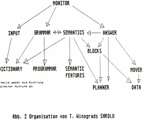 In diesen Bereich fallen die Anstrengungen zur maschinellen Übersetzung von Texten mit korrekter Grammatik. Es ist amüsant zu lesen, daß im sogenannten Gordon-Helmer-Bericht von 1964 [16] die Einführung solcher Programme bereits für 1978 vorausgesagt wurde. Der Hauptgrund für die unerwartet hohen Schwierigkeiten im Bereich der Sprachübersetzung liegt in der Mehrdeutigkeit menschlicher Sprache, die zu Mißverständnissen oder völligen Fehlinterpretationen führt. Der Standard-Demo-Satz 'Ich beobachte die Mädchen auf dem Hügel mit dem Fernglas’ ist ein Beispiel für die Mehrdeutigkeit menschlicher Sprache. Ein Meilenstein bei der Entwicklung von Software zur Spracherkennung stellt das 1972 von Terry Winograd veröffentlichte Programm SHRDLU zum Verständnis natürlicher (englischer) Sprache dar [18]. Eine ausführliche Beschreibung des in LISP geschriebenen Programms findet sich auch in dem Lehrbuch von C. M. Hamann [8]. Abb. 2 zeigt die Grundstruktur dieses Programms. Die angegebenen Programme sind miteinander vernetzt und rufen sich gegenseitig rekursiv auf. Allerdings beschränkt sich die Unterhaltung auf eine Bauklötzchenwelt, in der der Computer Klötzchen verschiedener Farbe und Form greifen und an anderer Stelle wieder absetzen kann. Es ist trotzdem verblüffend zu lesen, welch 'intelligente’ Unterhaltung sich zwischen dem Programm und dem Bediener ergibt [18]. Vom selben Autor stammt die [19] entnommene Abb. 3, die die zum Sprachverständnis erforderlichen Computeroperationen darstellt. In dieser Abbildung sind die verschiedenen Wissensbasen schraffiert. Die Implementation der dargestellten Programmteile ist noch keineswegs vollständig entwickelt. Dennoch zeigt der in [7] abgedruckte Musterdialog aus dem Hamburger Rede-Partner-Modell (FLAM-RPM) gegenüber SHRDLU ein erstaunliches Sprachverständnis und Alltagswissen. Allerdings bezweifelt Winograd, daß Computer die Aufgabe der sprachlichen Analyse jemals vollständig lösen können. Vielmehr sieht er in dem Computer ein nützliches, strukturiertes sprachliches Medium, also ein Werkzeug.