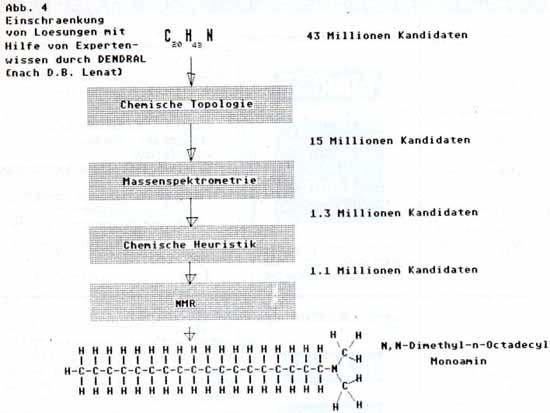 Die bislang erfolgreichsten Beispiele aus dem Bereich der KI sind sogenannte Expertensysteme. Das sind Programme, die auf eine Datenbank mit Wissen aus einem meist eng umrissenen Aufgabengebiet zurückgreifen und Schlußfolgerungen ziehen können, die denen von menschlichen Experten auf diesem Gebiet durchaus ebenbürtig sind. Die bekanntesten Beispiele sind MYCIN und DENDRAL. MACIN ist ein Expertensystem zur medizinischen Diagnostik bakterieller Blutinfektion und wurde von Edward H. Shortliffe [3] von der Universität Stanford (USA) entwickelt. Die Wissensbasis verfügt über mehr als 500 empirische Regeln. Die Regeln haben die Form „Wenn Bedingungen dann Ergebnis mit Wahrscheinlichkeit.“ So ist es möglich, die Wahrscheinlichkeit einer Diagnose, die in mehreren Stufen deduziert (hergeleitet) wurde, nach den Gesetzen der Wahrscheinlichkeitsrechnung zu berechnen. Können auf verschiedenen Wegen mehrere Diagnosen deduziert werden, werden sich diese i. a. in ihrer Wahrscheinlichkeit unterscheiden und somit eine Auswahl unter den möglichen Diagnosen erleichtern. DENDRAL ist ein Expertensystem zur Bestimmung der Struktur organischer Moleküle aus dem Massenspektrum, der NMR, und anderer Verfahren. Abb. 4 zeigt, wie der Entscheidungsbaum durch die Anwendung heuristischer Verfahren reduziert wird. Dieses Programm wurde von E. A. Feigenbaum [13] ebenfalls in Stanford entwickelt. Expertensysteme lassen sich deshalb relativ leicht erstellen, weil die Umsetzung der Fragestellung in eine Form der formalen Logik relativ einfach ist. Und Lösungswege für Probleme der formalen Logik sind seit der Einführung der Resolutionsmethode durch J. A. Robinson im Jahre 1964 [15] bekannt. Die Resolutionsmethode ist eine Computervariante des in der Mathematik bekannten Verfahrens des indirekten Beweises, in dem die zu beweisende Aussage negiert und zu einem Widerspruch geführt wird.