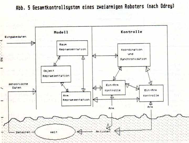 Selbstverständlich ist die Entwicklung von KI untrennbar mit der Entwicklung von Handhabungsautomaten (Originalton DIN) verbunden. Die zur Zeit in der Anwendung befindlichen Industrieroboter sind nämlich ziemlich „dumm“ und verlangen viel Programmieraufwand. So kann es bei ungeschickter Programmierung Vorkommen, daß zu dicht plazierte Roboter ohne tiefere Erkenntnis auf sich einschlagen und sich gegenseitig zerstören. Vom idealen Roboter werden deshalb menschenähnliches Orientierungsvermögen, Tastsinn, Seh- und Hörvermögen verlangt. Daß zumindest das Sehvermögen KI verlangt, ist wohl klar, wenn man sich an die verschiedensten optischen Täuschungen erinnert, mit denen uns unser Gehirn immer wieder überrascht. Solche optischen Täuschungen haben ihre Ursache nicht in einer fehlerhaften Optik, sondern sind auf die komplexe Auswertungssoftware in unserem Gehirn zurückzuführen. In einem sehr interessanten Artikel in der Zeitschrift BYTE [5] erläutern die Autoren, wie sie mit Hilfe von auf Rahmen basierender Wissensrepräsentation ein einfaches visuelles Erkennungssystem in PROLOG implementiert haben (Quelltext inclusive!). Dieses Programmsystem ist in der Lage, die Architektur einfacher Serienhäuser zu erkennen und ggf. architektonische Verbesserungsvorschläge zu machen. Die Autoren betonen allerdings, daß ihr System von der geringen Modellzahl der untersuchten Serienhäuser profitiert. Es gibt dagegen ein universelles visuelles System namens ACRO-NYM, welches in Stanford (der Name kommt in diesem Aufsatz öfter vor) von T. Binford entwickelt wurde [2], Wesentlich mehr Schwierigkeiten bereitet den Forschern aber seltsamerweise die Entwicklung multipler Manipulatoren, wie sie. erforderlich sind, um feinmechanische Aktivitäten in den Griff zu bekommen. Für einen zweiarmigen Roboter stellt z. B. die Aufgabe, einen Bleistift waagerecht zwischen den „Fingern“ zu halten und dessen Enden gegenläufig kreisen zu lassen, ein enormes Problem dar. Zur Bewältigung dieser Aufgabe müssen nämlich eine Vielzahl sensorischer Daten in Echtzeit empfangen und koordiniert werden. Ein Gesamtkontrollsystem eines zukünftigen zweiarmigen intelligenten Roboters zeigt Abb. 5 [9]. Natürlich darf die selbständige Roboternavigation im Reigen der KI nicht fehlen. Man sieht ja manchmal schon Transportroboter durch menschenleere Fabrikhallen huschen, aber diese laufen allesamt in besonders präparierten Umgebungen. Ziel der autonomen Navigation ist es, einem Roboter beizubringen, in einem ihm unbekannten Raum vom momentanen Standpunkt aus zu einem vorgegebenen Ziel zu gelangen. Natürlich müssen evtl, vorhandene Hindernisse erkannt und umgangen werden. Außerdem sollte möglichst schnell der kürzeste Weg zum Ziel gefunden werden. Und falls der Roboter nun doch einmal in der Gegend herumirrt, sollte er wenigstens in der Lage sein, aus seinen Fehlern zu lernen und während seiner Erfahrt eine genauere Karte seiner Umgebung anfertigen [10]. Stand der Dinge sind Geräte mit der Leistung von HERMIES, einem PC auf Rädern mit einem Sonarsystem [11]. Abb. 6 zeigt, wie er sein Ziel erreicht. Die Hindernisse waren nicht einprogrammiert, sondern wurden im Verlauf der Bewegung geortet.