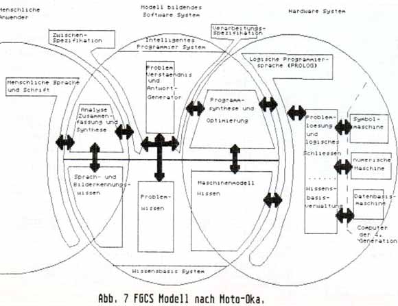 Um die anfallende Datenflut zu bewältigen, sollen parallel arbeitende Computer in einem System zusammengefaßt werden. Parallele Datenverarbeitung setzt aber nebeneffektfreie Sprachen voraus, wie sie z. B. in den eingangs erwähnten, applikativen Sprachen vorliegen. Im FCGS (Fifth Generation Computer System) Report wird namentlich PROLOG erwähnt. So wird man also bei der Durchschlagskraft der Japaner auf dem Computergebiet damit rechnen müssen, daß Prolog in der Zukunft erheblich an Bedeutung zunehmen wird. Und wie soll er aussehen, der Supercomputer der 5. Generation, der nun wirklich intelligent sein soll? Abb. 7 zeigt die aus [14] entnommene Skizze. Eine Problemlösungsmaschine steuert die Symbole verarbeitenden und numerische Berechnungen durchführenden Computer der 4. Generation. Diese ist gekoppelt mit einer Maschine, welche die Datenbasis verwaltet. Diese Maschine wird in einer logischen Programmiersprache programmiert, die von einem übergeordneten Softwaresystem gesteuert wird. Dieses System soll die Verwaltung der Heuristiken sowie die Auswertung des menschlichen Peripherieinterfaces (also Sprache verstehen, Bilder erkennen etc.) übernehmen. Ganz links dann der Mensch, der seine Aufgabenstellung nahezu in Umgangssprache formulieren darf.