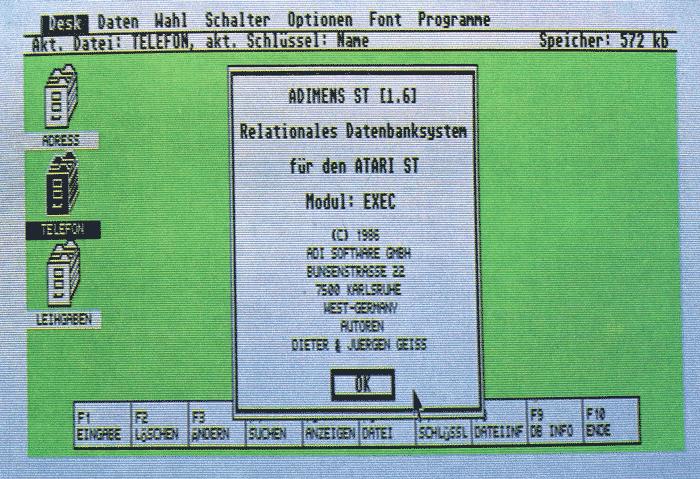 Adimens ST ist eine solche relationale Datenbank. Das Programm wurde von dem renommierten deutschen Softwarehaus ADI entwickelt. Mit ihm kann man bis zu 16 unterschiedliche logische Dateien miteinander verknüpfen. Das erspart ein mehrfaches Erfassen und Ändern von Daten. Adimens verfügt über eine eigene "Shell", über die einzelne Programm-Module aufgerufen werden können. Das Programmpaket besteht aus folgenden Bestandteilen: