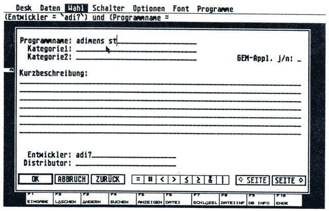 Für wen die Art der Maskengenerierung unter TOS zu umständlich ist, ist Trost in Aussicht: Zur CeBIT im Frühjahr wird ein Update vorgestellt werden, in dem das INIT-Modul in GEM eingebunden ist. Die Maskenerstellung geschieht dann ähnlich wie unter DB Master. Ferner werden in dieser Version Möglichkeiten zum Stapelbetrieb und zu Rechenoperationen implementiert sein. Die Rechenfelder sollen dann, ähnlich wie beim Menüpunkt "Wahl" definiert und abgespeichert werden können, so daß man immer darauf zurückgreifen kann. Die Update-Version wird gegen eine Gebühr im Austausch erhältlich sein, so daß man schon jetzt ohne Probleme mit Adimens arbeiten und seine "alten" Dateien später weiterbenutzen kann.