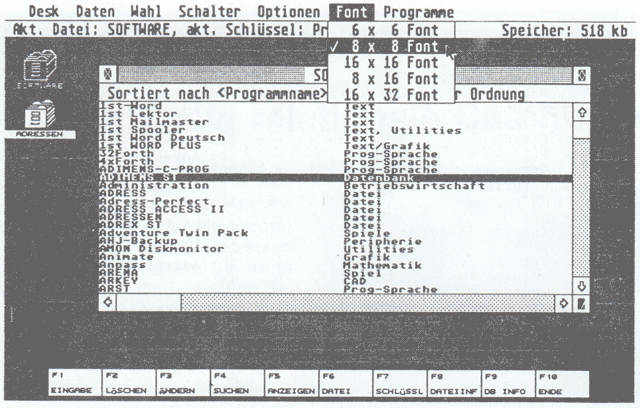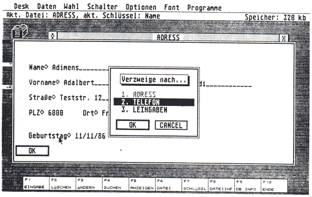 Jede Datei, die zu einer Datenbasis gehört, bekommt ein eigenes Karteikastensymbol auf dem Bildschirm. Durch Anklicken des Symbols wählt man zwischen den verschiedenen Dateien und läßt deren Inhalte anzeigen. Die Ausgabe der Daten erfolgt wahlweise in Listenform (siehe Bild 2) - wobei zwischen fünf verschiedenen Zeichensätzen gewählt werden kann - oder als Maske (siehe Bild 3). Wählt man die Listenform, erhält man durch Anklicken des betreffenden Listeneintrags sofort die dazugehörige Maske. Ein Nachteil daß jeder Dateizugriffspfad nur einmal angesprochen werden kann. Der Vergleich von verschiedenen Datensätzen einer Datei ist deshalb manchmal umständlich. Beim Eingeben der Daten in die Maske darf man nur das letzte Datenfeld der Maske mit Return abschließen.