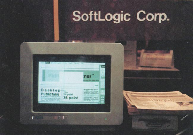 Ganz anders dagegen das Programm Publishing Partner der SoftLogic Corp. (Vertrieb: Knupe, Dortmund), welches die Möglichkeiten des Apple LaserWriter und jeder Postscript-fähigen Einheit unterstützt. Ausgaben von 6 bis 144 Punkten Spiegelschrift. Invertieren und seitenverkehrtes Schreiben sind nur einige der Möglichkeiten dieses Paketes. Als wichtigstes bei diesem Paket erscheint mir die Ausgabe WYSIWYG -„What you see, is what you get“, d. h. man sieht alles auf dem Bildschirm so, wie es hinterher auf dem Drucker ausgegeben wird, auch die volle Druckerseite, natürlich auf dem Monitor verkleinert dargestellt. Dieses Produkt soll ab Ende Januar 1987 auch in Deutschland verfügbar sein, wie mir Hersteller und Distributor auf der Comdex erklärten.