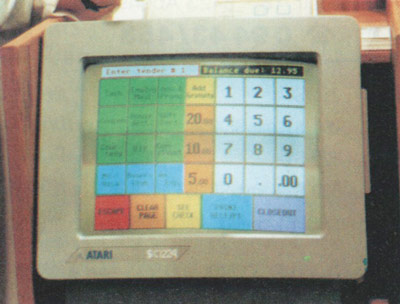 Ein ganz neues Anwendungsgebiet mit dem Atari ST wurde von Video Touch vorgestellt und zwar ein Berührungsbildschirm. Auf einem Atari Farbmonitor waren farbige Felder dargestellt, die nach Fingerberührung die entsprechenden Programmpunkte abarbeiteten, bzw. ein Menü aus verschiedenen Gerichten zusammenstellen ließ und dazu gleich die Rechnung schrieb. Interessant könnte so eine Anwendung beispielsweise in der Gastronomie und SB Läden werden oder auch als Informationssystem auf Ausstellungen oder ähnlichem, wo der Benutzer, ohne eine Tastatur oder Maus bedienen zu müssen, bestimmte Eingaben am Bildschirm durchführen kann. Ein komplettes Entwicklungssytem bestehend aus Atari 1040, modifiziertem Farbmonitor, einer Harddisk (20 MB) und einem Bon Drucker von Star wurde für ca. $ 5000,-angeboten.