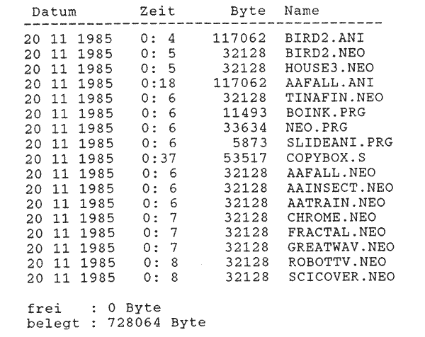 Eine bei manchen Anwendungen wichtige Routine ist die Anzeige des Directories. Dazu sind mehrere Systemaufrufe nötig. Der erste lautet FSETDTA und setzt die Disketten-Transfer-Adresse, ab der DTA-Puffer steht. In diesem Puffer werden, von den folgenden Befehlen, die kompletten Directory-Informationen abgelegt. Der Puffer muĂ eine GröĂe von 44 Byte haben und kann als ARRAY oder RECORD angelegt werden. Er enthĂ€lt folgende Informationen: