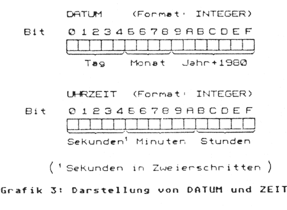 Das Programm DIRECTORY (Listing 4) zeigt, wie das Directory eines beliebigen Laufwerkes gelesen und auf dem Bildschirm angezeigt wird. Dieses Programm verwendet fast alle der bereits besprochenen Routinen und gibt die Directory in âaufbereiteterâ Form aus (siehe Bild 2). Das jeweilige Directory-File wird hier in einem Record abgelegt, um einen unkomplizierten Zugriff auf die einzelnen Elemente zu haben. Bei nĂ€herer Betrachtung dieses Records wird Ihnen auffallen, daĂ das Datum und die Uhrzeit in jeweils einer Integer-Zahl abgelegt werden. Der genaue Aufbau beider Zahlen kann der Grafik 3 entnommen werden. Die einzelnen Daten (z. B. Tag, Monat, Jahr) mĂŒssen erst voneinander 'getrenntâ werden. Diese Arbeit erledigt das Programm mit einigen Schiebe-Befehlen (ShR & ShL), die man sich eventuell etwas genauer anschauen muĂ.