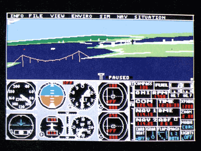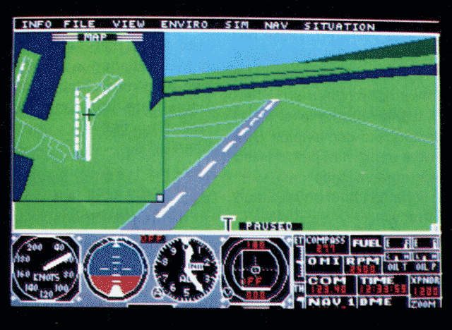Die Grafik ist dank des 16-Bit-Prozessors recht schnell und gleitet fast ruckfrei über das Bildschirmfenster, dessen Größe und Lage vom Benutzer bestimmt werden kann. Es kann sehr klein sein oder auch den gesamten Bildschirm ausfüllen. Dann sind jedoch die Instrumente nicht mehr sichtbar -doch wofür gibt es den Auto-Piloten!