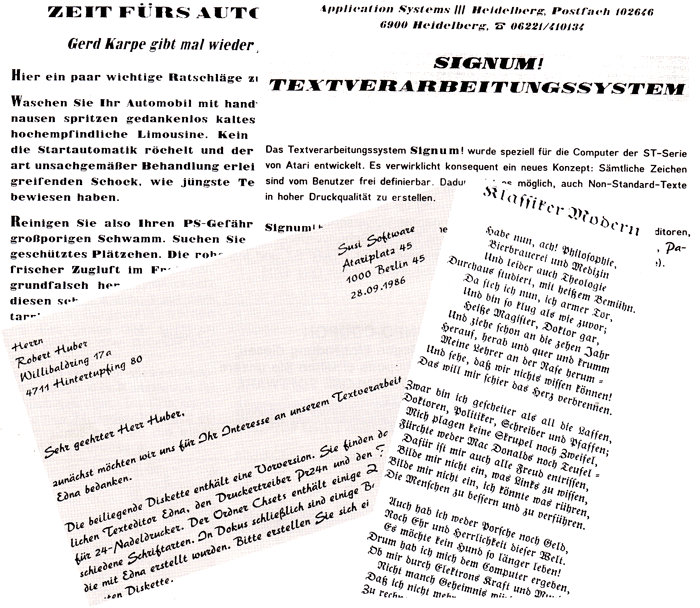 SIGNUM verfolgt ein völlig neues Konzept bei der Textverarbeitung. Es arbeitet ausschließlich im Grafikmodus und bietet dadurch ungeahnte Möglichkeiten. Der Zeichensatz kann frei definiert werden und die einzelnen Zeichen sind pixelweise positionierbar. Der Clou ist aber, daß Blocksatz und Proportionalschrift auf dem Bildschirm dargestellt werden und dies genau dem späteren Ausdruck auf dem Drucker entspricht.