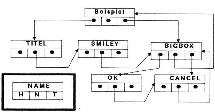 Es gibt verschiedene Möglichkeiten, diese Struktur auf einem Rechner abzubilden. Üblicherweise stellt man Bäume im Speicher des Computers als eine Ansammlung von Knotenobjekten dar, in deren Zeigerkomponenten die ADRESSEN von anderen Objekten im Baum stehen. Digital Research ist bei GEM einen etwas anderen Weg gegangen.