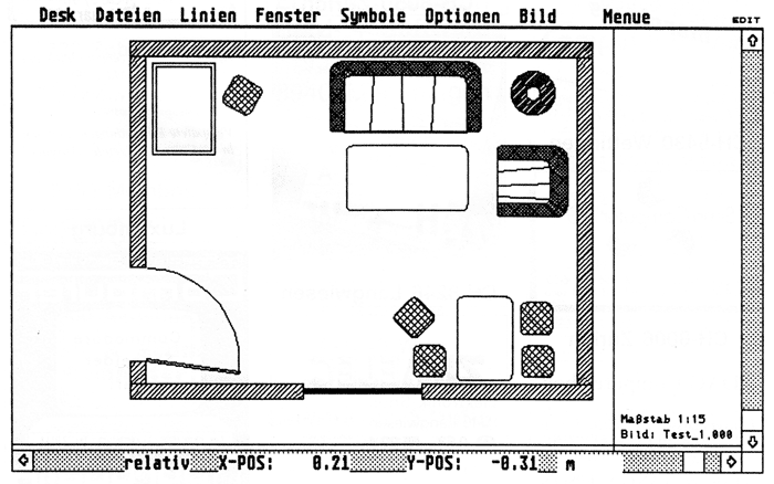 GFA-DRAFT arbeitet mit der Fenster- und Menütechnik, fast alle Befehle werden mit der Maus abgesetzt. Diese nimmt somit die Funktion eines Grafiktabletts ein, wie es bei professionellen Anlagen eingesetzt wird. Durch die ständig angezeigten Koordinatenangaben (mm oder Zoll) wird dieses präzise, aber teuere Eingabegerät sehr gut ersetzt. Die Koordinaten können absolut oder relativ zum letzten Punkt angegeben werden. Sie können aber auch die Länge der Linie anzeigen, was besonders bei schrägen Linien sehr wichtig sit. Waagrechte und senkrechte Bewegungen lassen sich neben der Maus auch mit den Cursortasten ausführen, dabei sind große Sprünge ebenso möglich wie ein pixelweises Weiterrücken des Cursors. Der Cursor ist in der Grundeinstellung als großes Kreuz ausgeführt, dadurch lassen sich auch hiermit gut Waagrechte und Horizontale ziehen.