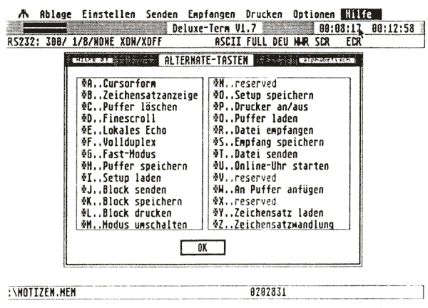 Während ST-Term sich von Terminalsoftware für „normale“ Computer weder in der Bedienung noch auf dem Bildschirm unterscheiden, hat der Programmierer von Deluxe-Term alle Register gezogen und ein typisches GEM-Produkt geschaffen. Es wurde aber auch an Benutzer gedacht, die meinen: „Wozu Mausbedienung in einem Terminalprogramm“. Bild 3 zeigt ein Help-Menü in dem die Bedeutung von Alternate-Tasten gezeigt wird. Die meisten Funktionen können also auch ohne Maus erreicht werden. Deluxe-Term gibt dem Benutzer noch eine dritte Möglichkeit der Programmsteuerung. In der dritten Bildschirmzeile werden Statusinformationen angezeigt. Durch einfaches Anklicken der Kürzel in dieser Statuszeile können alle angezeigten Einstellungen umgeschaltet werden.