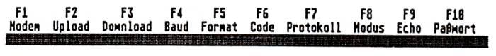 ermöglichen es dem Benutzer Dateien von der Diskette abzusenden, bzw. die empfangenen Daten in eine Datei zu schreiben. Nach Drücken von „F3“ werden alle ankommenden Daten auf Diskette gesichert. Bei der „Unmenge“ von brachliegendem Ram hätte es sich unbedingt angeboten, ankommende Daten im Speicher zu puffern. Man könnte z. B. beim Stöbern in einer Mailbox den Puffer auf Diskette sichern, wenn man entdeckt, daß etwas interessantes ankam.