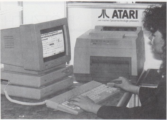 Auch neue Drucktechnologien wurden von A1ARI berücksichtigt. Auf der CeBIT wurde als Weltpremiere der ATARI-SLM-Laserdrucker erstmals vorgestellt. Er hat eine Druckgeschwindigkeit von acht Seiten pro Minute bei einer Auflösung von 300 Punkten pro Zoll. Somit ist er um ein mehrfaches schneller als jeder Typenraddrucker, der nur annähernd vergleichbare Ergebnisse liefert. Der Laserdrucker von ATARI ist außerdem grafikfähig und kann jeden Schrifttyp sowie jede Darstellung des Bildschirms, in welcher Auflösung auch immer, wiedergeben. Die Steuerung wird direkt vom Rechner übernommen, so daß er nur in Verbindung mit einem Mega ST mit mindestens 2 MB sinnvoll zu betreiben ist. Das hat den Vorzug, daß der Laserdrucker keinen eigenen Speicher benötigt. Deswegen braucht er auch keinen besonderen Zeichensatz zu laden, sondern übernimmt ihn direkt vom Computer. Der Drucker wird am DMA-Port angeschlossen, bietet aber die Möglichkeit, weitere für den DMA-Port bestimmte Geräte anzuschließen. Dazu wird eine Interfacebox im Lieferumfang enthalten sein. Mit dem Laserdrucker, der mit einem ATARI Mega ST2 für ca. DM 6000,- zu haben sein wird, ist es also möglich, für wenig Geld in die Welt des Desktop-Publishing richtig einzusteigen. Auch hier wird Anfang Sommer als Termin für die Markteinführung genannt. Bei ATARI wird sogar erwogen, das Kombinationspaket mit einem Desktop-Publishing-Programm inklusive auszuliefern.