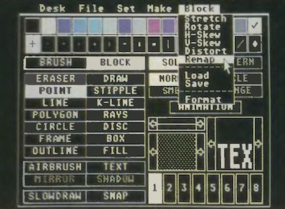 Ein Teil des Bildschirms kann als Block festgelegt werden. Die Fläche ist im einfachsten Fall rechteckig. Aber auch eine Form, die aus bis zu 25 Linien besteht, ist realisierbar. Dieser Block kann in jedes Bild kopiert oder auch als Pinsel verwendet werden. Aber jetzt kommt das Beste: Man kann stufenlos vergrößern und verkleinern, drehen, horizontal oder vertikal ziehen und verzerren. Eine Unzahl von Effekten ist damit zu bewerkstelligen, die sonst gar nicht denkbar wären (siehe Bildschirmfotos).