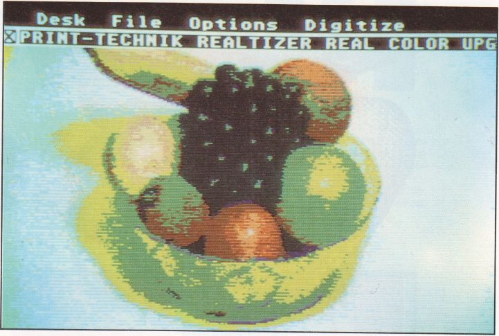 Der Digitizer von Print Technik kennt noch einen anderen Modus, um Farbbilder zu erzeugen. Er beruht auf der Tatsache, daß ein buntes Bild aus der Mischung der drei Grundfarben Rot, Grün und Blau entsteht. Mischt man die Einzelbilder, so entsteht ein Farbbild. Genauso wird es bei diesem Digitizer gemacht: Bei Verwendung eines Farbmonitors und mit dem mitgelieferten DIGICOL-Programm werden drei Bilder unter Zuhilfenahme von drei Farbfiltern (Rot, Grün und Blau) aufgenommen. Aus diesen drei Einzelkomponenten setzt der Rechner ein farbiges Bild zusammen. Man darf natürlich keine bewegten Objekte mit dieser Methode aufnehmen. Eine andere Einschränkung ist, daß diese Art von Digitalisierung nur in der niedrigsten Auflösung funktioniert: Eine ziemlich seltsame Methode, die sich aber als sehr sinnvoll und trickreich erwiesen hat.