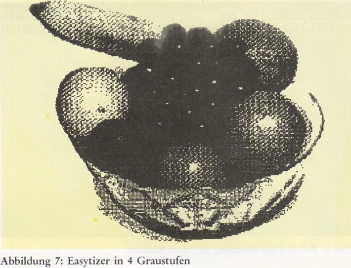 Eine der stärksten Seiten des Digitizers ist die Verarbeitung von Graustufen. Bis zu 16 verschiedene Grautöne lassen sich auf dem Bildschirm wiedergeben. Die Wiedergabe von Graustufen bewirkt einen fließenden Übergang von weiß bis hin zu schwarz, wodurch ein Bild einen weichen, fotoähnlichen Charakter bekommt. Bei einer Schwarz-Weiß-Digitalisierung ohne Erkennung von Grauwerten wird theoretisch jeder einzelne Pixel des Monitors entweder gesetzt oder nicht gesetzt. Beim Realtizer von Print Technik ist die maximale Auflösung jedoch immer eine 2x2 Matrix (vier Pixel), was einer Auflösung von 320x200 Bildpunkten entspricht. Um Grautöne auf einem Schwarzweiß-Monitor wiederzugeben, muß man sich verschiedene Muster schaffen, die aus mehreren Pixeln "bestehen. Dadurch entsteht zwar eine Verminderung der Auflösung (4x4 Matrix), der Gesamteindruck eines Bildes wird jedoch meist verbessert. Man kann in der Menüleiste zwischen vier verschiedenen Optionen wählen: Gar keine Grautöne (bedeutet schwarzweiß), vier, acht oder sechzehn. Erwähnenswert ist die Mühe, die sich der Softwarehersteller bei der Realisierung dieser