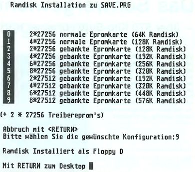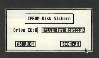 Die Steuersoftware wird auf Diskette mitgeliefert und dürfte den Besitzern des Easyprommers schon bekannt sein. Es handelt sich um ein sogenanntes Install- und Save-Programm, mit dem es möglich ist; jedes nicht kopiergeschützte Programm (also auch Accessories oder Autostart-Programm) in eine für EPROMs verständliche Form umzuwandeln und somit auf dieser oder einer gewöhnlichen 128 KByte EPROM-Karte lauffähig zu machen. Diese beiden Programme erlauben es also, Programme von Diskette so aufzubereiten, daß sie mit einem Programmiergerät, wie etwa dem Easyprommer, in EPROMs gebrannt werden und anschließend von einer EPROM-Karte problemlos gestartet werden können. Die Vorgehensweise ist dabei denkbar einfach; mit dem Install-Programm richten Sie eine RAM-Disk entsprechender Größe ein (siehe Bild 2). Diese RAM-Disk füllen Sie dann im gewohnten Desktop mit möglichst vielen Programmen, d. h. mit den Programmen, die Sie auf der EPROM-Karte haben möchten. Dabei spielt es keine Rolle, ob es sich um gewöhnliche Programme, Accessories, Auto-start-Programme im Ordner oder nur um Daten etc. handelt. Nachdem die RAM-Disk gefüllt ist, startet man das Save-Programm (siehe Bild 3). Elier gibt man der EPROM-Karte eine „Laufwerkskennung“ und muß entscheiden, ob von der EPROM-Karte gebootet werden soll oder nicht. Dieses Programm erzeugt nun aus den Programmen auf der RAM-Disk ein File auf Diskette, das schließlich mit einem Programmiergerät in EPROMs gebrannt werden kann. Nützlich ist es z. B., das File „DESKTOP.INF“ mitzubrennen. Man erhält dann immer nach dem Einschalten des Rechners einen nach seinen Wünschen 'aufgeräumten’ Bildschirm (Desktop).