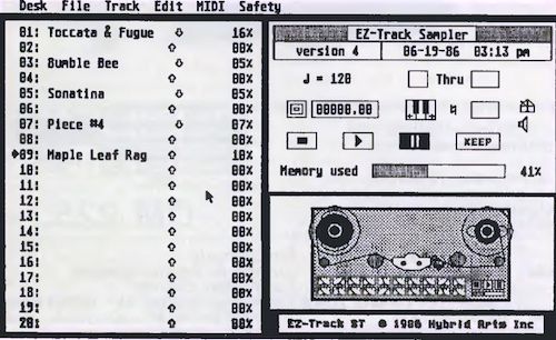 Dieses Programm wendet sich von seiner Konzeption her weniger an den Profi als den Hobby-Musiker, der nur gelegenlich und mit wenig Aufwand Musik machen möchte. Der Preis für den EZ-Track Sequencer liegt mit 150 DM in einer angemessenen Kategorie. Die Bedienung des Programms erinnert an die eines Tonbandgerätes. Die Steuerung erfolgt unter GEM. Der Bildschirm ist zweigeteilt: Links findet man Anzeigen für jede der zwanzig Spuren, rechts die ’Bedienungselemen-te’, die Start- und Stoptasten der elektronischen Midi-Bandmaschine. Sofort fällt auf, daß diese Bandmaschine weder eine Aufnahmetaste noch Tasten für Vor- und Rückspulen besitzt.