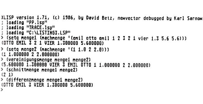 Abb.1: Mengenoperationen in XLISP mit Programm Listing 3.
