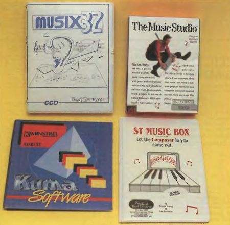 Für den folgenden Vergleichstest standen vier Programme zur Verfügung: „Music Studio“ von Activision, „Minstrel“ von Kuma, „Musix 32“ (CCD) und „Music Box“ (XLEnt-Software). Beginnen wir mit dem Activision-Music-Studio.