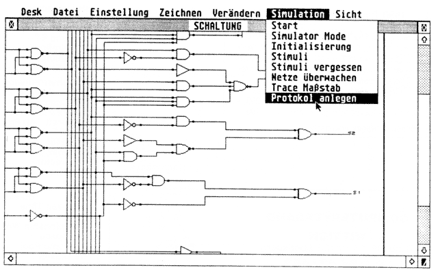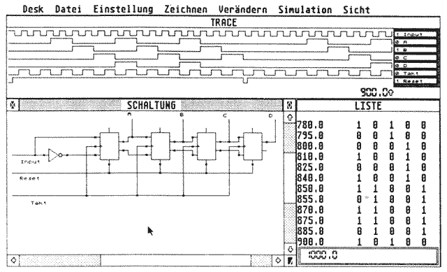 Selbstverständlich kann die Laufzeit der Simulation eingegeben werden. Wie bei allen Zeitangaben kann auch hier zwischen relativer und absoluter Angabe gewählt werden (die relative Eingabe erlaubt die Fortführung einer bereits begonnenen Simulation). Treten während der Simulation Störungen an irgendwelchen Leitungsnetzen auf, meldet sich der Simulator mit dem Angebot, den betroffenen Ausschnitt vergrößert im Schaltungsfenster zu zeigen. So hat man eine schnelle Kontrolle über eventuelle Schaltungsoder Eingabefehler. Die Ergebnisse der Simulation lassen sich als Liste speichern und dann als ASCII-File weiterverwenden. Leider gibt es keine Möglichkeiten, die Timingdiagramme aus dem Trace-Fenster auszudrucken. Für beide Simulationsfenster besteht die Möglichkeit, mit den Cursortasten durch die Ergebnisse hindurchzuscrollen, die Ausgabe des Trace-Fensters besitzt darüber hinaus noch eine Zoom-Funktion.