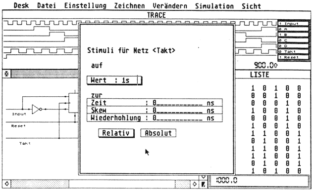 Um die Schaltung für die Simulation mit sinnvollen Eingangswerten zu versehen, können sogenannte 'Stimuli' eingegeben werden. In einer Dialogbox kann jede Leitung mit den Zuständen 1,0 oder unbekannt versehen werden. Zusätzlich kann jedem Zustand ein Attribut, das die Art des logischen Zustands angibt, beigegeben werden. Dabei stehen die Typen strong, resistive und hiz (hochohmig) zur Verfügung. Weiterhin kann ein Zeitpunkt angegeben werdden, zu dem eine Leitung den gewünschten Zustand annimmt und ob sich der Vorgang gegebenenfalls wiederholen soll. Um z. B. einen Takt mit der Periode 50 ns auf einer Leitung zu definieren, müßte man die Leitung zum Zeitpunkt 0 auf log. 1 setzen und dies alle 50 ns wiederholen lassen. Dann müßte man die Leitung zur Zeit 25 ns auf log. 0 setzen und auch hier wieder einen Wiederholungsfaktor von 50 ns eingeben. Leider existiert keine Ubersichtsdarstellung aller gesetzten Zustandsveränderungen einer Leitung. Bei Fehlern muß man sehr genau wissen, was man bisher eingegeben hat, um die Korrektur zum richtigen Zeitpunkt durchzuführen. Sonst spuken auf den Eingabeleitungen plötzlich ungewollte Impulse herum.