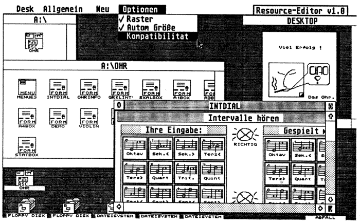 Das Programm arbeitet mit jedem Rechner der ST-Serie zusammen; auch der Farbmonitor wird unterstützt, allerdings nur in mittlerer Auflösung. Zum Testen standen uns eine deutsche und eine englische Version zur Verfügung; deutsches und englisches Handbuch sind weitgehend gleich und weder besonders ausführlich noch instruktiv. Gewisse Vorkenntnisse über die Struktur der AES-Resourcen sollte man schon besitzen.