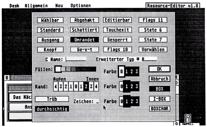 Beliebig viele Resource-Dateien können geladen werden. Jede Datei erhält ein eigenes Icon auf dem Desktop. Diese Icons lassen sich wie die Floppy-Icons durch Doppelklick öffnen und zeigen ihren Inhalt wie Floppyinhaltsverzeichnisse in einem Fenster. Wiederum wie bei Inhaltsverzeichnissen können dann auch die einzelnen Objektbäume des Resourcefiles durch Doppelklick geöffnet werden. Auch Objekte im Fenster der Objektbäume können einfach mit Doppelklick 'geöffnet’ werden; Sie bekommen dann aber kein eigenes Fenster, sondern eine Dialogbox, die sämtliche für das ausgewählte Objekt vorhandenen Einstellmöglichkeiten anzeigt. Das ist einfach und übersichtlich. Fast selbstverständlich existiert wie im Desktop auch ein 'Datei’-Menü (hier heißt es 'Allgemein') mit den Kommandos 'öffnen' und 'schließen'. Wie im 'Datei’-Menü des Desktops findet sich auch ein 'Fenster schließen’ und 'Info-Anzeige' Kommando. Die Funktionen dieser Befehle entsprechen denen des Desktops. Zuletzt enthält das 'All-gemein’-Menü noch das obligatorische ’Beenden’-Kommando, das allerdings auf jegliche Sicherheitsabfrage vor dem Verlassen des Editors verzichtet. Daten, die nicht gesichert wurden, gehen unwiederbringlich verloren. Überhaupt sind Sicherheitsabfragen keine Stärke des Programms: Auch der Papierkorb des KResource-Desktop schluckt ohne Nachfrage alles. Und er kann auch nicht, wie sein Kollege auf dem GEM-Desktop, wieder geöffnet werden. Dann erscheint die Nachricht: 'Der Papierkorb darf aus hygienischen Gründen nicht geöffnet werden’.