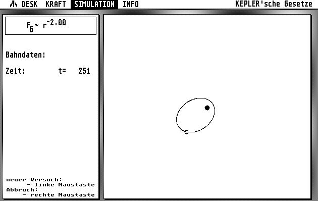 Nach diesem Leckerbissen für Chemiker kommen auch die Physiker auf ihre Kosten. KEPFER, ein Simulationsprogramm von Robert Becker, berechnet die Laufbahnen von bestimmten Modellmassen in einem Gravitationsfeld anhand der Methoden der klassischen (Newtonschen) Mechanik und zwar nach dem 1., 2. und 3. Keplerschen Gesetz. Man sieht dabei sehr schön, wie sich diese Körper bewegen und unter welchem Winkel sie eine stabile Umlaufbahn erreichen. Während des Simulationsvorgangs können in beliebiger Auswahl Bahndaten angezeigt werden (Auswahl durch Anklicken). Neben der Untersuchung der Bahnbewegung in realen Feldern kann im Modell ebenfalls das Verhalten in anderen Feldstrukturen verglichen werden (PD 57).