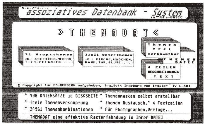 Ein Datenbank-System, das eine Datei themenorientiert verwalten kann, wird von einem Programmierer aus Hildesheim für den ST angeboten. Mit dieser Datenbank steht dem Anwender ein preiswertes System zur Verfügung, mit dem man verschiedene Daten nach Themen ablegen und suchen kann.