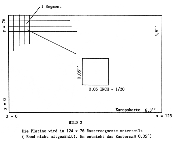 Jede Seite der Platine wird in 124 x 76 Rasterpunkte unterteilt, wodurch 9.424 Segmente pro Seite entstehen. Jedes Muster eines Segmentes hat einen Code zwischen 6 und 45 (0 als leeres Segment, 40 verschiedene Muster sind zugelassen), der unter dem Ort auf der Platine als Index im Array Platine [X + 128 * 'Y] abgespeichert ist. Die unteren 8 Bit des Integerwertes enthalten den Code für die Oberseite, die oberen den Code für die Unterseite.