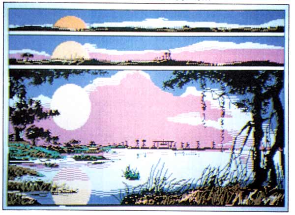 Nach einer längeren Ladezeit (zwei Disketten) ertönt eine digitalisierte Musiksequenz aus dem Lautsprecher. Danach startet das Spiel und - siehe da - ein alter Bekannter! Nicht nur, dass es sich bei der Spielidee um ein klassisches Ballerspiel handelt dieses Spiel hat auch eine verblüffende Ähnlichkeit mit XTRON, das in einer der vorherigen Ausgaben besprochen wurde. Diese Ähnlichkeit ist kein Zufall, denn schließlich ist es das gleiche Autoren-Team, das beide Spiele entwickelt hat. TYPHOON Ist also eine neue Variante des alten Spiels. Ein Raumschiff überfliegt eine von Szene zu Szene wechselnde Landschaft und wird dabei von anderen Raumschiffen angegriffen. Die Raumschiffe kommen aus allen Ecken, zusätzlich fliegen noch Gegenstände durch den Raum, die man nicht berühren soll. Auf dem Bildschirm herrscht somit bisweilen ein wunderschönes Chaos, das von JoystickAkrobaten wirklich das Letzte verlangt. Der Spieler kann jedoch sein Raumschiff über den gesamten Bildschirm bewegen und somit völlig ungebunden jedem Angreifer entgehen. Wenn man es am Anfang einer Runde schafft, einen der heruntertrudelnden Taler aufzufangen, dann sind die besten Voraussetzungen gegeben, die Runde schadlos zu überstehen, denn jetzt ist entweder das Ballern viel effektiver, oder man ist für eine Weile unverwundbar.