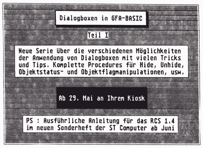 Mit einer in diesem Heft beginnenden, ausführlichen Serie wird der Autor über seine derzeitige Lieblingsbeschäftigung berichten - Einbindung von Dialogboxen in GFA-Basic.