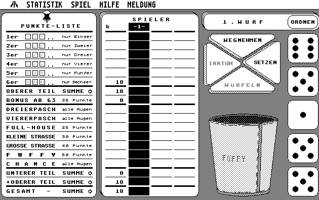 Dieses Spiel ist inhaltlich vergleichbar dem bekannten KNIFFEL aus der ’Nicht-Computer Szene’. Im letzten Monat stellten wir bereits ein ähnliches Würfelspiel vor, dieses wurde aber um einige Punkte erweitert. So lassen sich nach einigen Spielen anschauliche Statistiken über den Würfel- und Spielverlauf anzeigen. Auch die übrige Gestaltung ist sehr schön programmiert und wird zum Spielen empfohlen (PD 63).