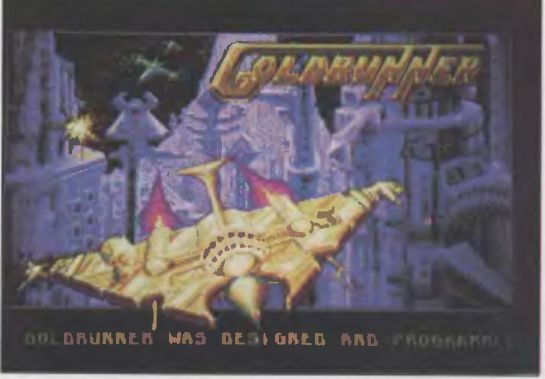GOLDRUNNER ist ein super-schnelles Ballerspiel von MICRODEAL. Ein sehr wendiges Raumschiff überfliegt die Ringwelten der Tritonen, die unbedingt vernichtet werden müssen. Natürlich sind Sie der Einzige, der dies schaffen könnte, und deshalb geht es auch gleich los. Beim Überfliegen eines Ringes muß alles zerstört werden, was nur geht. Deshalb wird fast ständig aus vollen Rohren geschossen. Mit wahnsinnig hoher Geschwindigkeit wird die Gegend überflogen, doch ist dabei die Gefahr sehr groß, an einem der hohen Gebäude zu zerschellen. Aber es gibt noch andere Gefahren: urplötzlich tauchen feindliche Raumschiffverbände auf, die zwar nicht auf Rammkurs sind, dafür aber heimtückische Raketen abschießen. Wenn mehrere Treffer eingesteckt worden sind, verliert man entweder die Laserkanonen oder den Beschleunigungs-Booster. Dann ist bald der Zeitpunkt erreicht, an dem nichts mehr funktioniert und das Schiff letztlich explodiert.