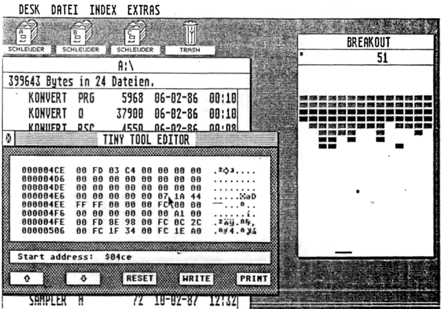 Wird das Programm aus dem Desktop oder dem Auto-Ordner gestartet, überprüft es erst, ob es sich schon im Speicher befindet. In diesem Fall zeigt der 7. Eintrag der VBL-queue auf die Startadresse. Wir müssen also nur eine festgelegte Adresse innerhalb unseres Programms abfragen, und erfahren so, ob das Programm schon Speicherresident geladen ist. Die Aufgabe dieser sogenannten Magic-number übernimmt hier das Langwort ab Label progr + 2. Ist das Programm schon geladen worden, verabschiedet sich das Programm mit entsprechender Meldung. Starten Sie es aber zum ersten Mal und bestätigen die Frage „resident halten“ mit „J“ oder „j“, wird die eigentliche Copy-Routine ab Label progr mit Hilfe der Gemdos-Funktion $31 resident gehalten und die Startadresse in die VBL-queue eingetragen. An die Stelle „progr“ wird ab jetzt gesprungen, wenn Sie Alternate + Help bestätigen.
