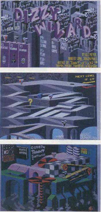Wer DIZZY WIZARD das erste Mal sieht, wird sich vielleicht an MARBLE MADNESS auf dem AMIGA erinnern. Doch dieser Vergleich ist nicht ganz richtig, denn Spielidee und Ausführung sind sehr verschieden: Ausgehend von einem Stand von 10.000 Punkten muß eine Flamme zu einem Zeitpunkt gebracht werden. Die Strecke, die dabei zurückgelegt werden muß, ist labyrinthartig verschlungen und birgt auch sonst noch einige Hindernisse (springende Bälle, Klippen u. ä.), die den Punktestand vermindern. Wichtig ist nur, die Flamme innerhalb der vorgegebenen Zeit und mit einem Punktestand von mindestens 10.000 an den Bestimmungsort zu bringen -denn sonst kommt man in die 'Maschine’, in der man die fehlenden Punkte ’abarbeiten’ muß.