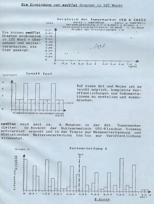 Die Firma INTERFACE in Gießen bietet jetzt ein einzigartiges ST-Programm an, mit dem alle medizinischen Standard-Statistikauswertungen erledigt werden sollen. MedSTat kann zum Beispiel Regressionen, Signifikanztest, Cut-Off-Auswertungen und Perzentilverteilungen (demnächst auch ROC-Analysen) berechnen. Die ausgegebenen Grafiken und Tabellen (Drucker oder Bildschirm) können über Snapshot in 1st Word Plus übernommen werden. Das Programm ist vollständig mausgesteuert und wird in Kürze durch Patientenverlaufskontrollen und -Stammdatenverwaltung ergänzt. Mit einem ausführlichen Handbuch kostet es 198,-DM.