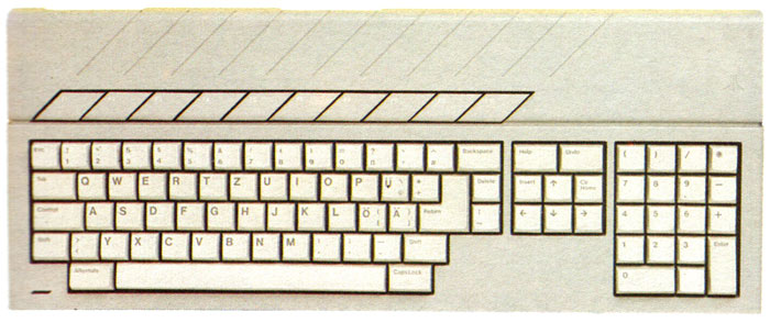 Die Neuerungen fangen schon bei der Tastatur an. Sie wurde vom Rechnergehäuse abgetrennt und wird über ein steckbares flexibles Spiralkabel mit ihm verbunden. Selbst der Anschlagdruck der Tasten ist verbessert worden. Die Federung ist jetzt härter, so daß das Schreiben sicherer und angenehmer ist. Dadurch, daß die Zentraleinheit nicht mehr zur Tastatur gehört, konnte diese in der Tiefe wie in der Höhe verkleinert werden. Eine flachere Tastatur ist an die schreibenden Hände angepaßt und läßt sich dadurch besser bedienen. Das Keyboard kann wahlweise direkt auf vier im Gehäuseboden versenkte Gummifüße oder auf zwei Klappbügel gestellt werden, so daß sich eine größere Neigung nach hinten ergibt. Ferner befinden sich der Maus- und der Joystick-Anschluß nicht mehr wie gewohnt an der rechten Seite (bzw. unter dem Rechner wie beim 1040 STF), sondern an der Unterseite der Tastatur sind zwei Einbuchtungen, in denen die zwei neunpoligen Stecker angebracht sind. Das Mauskabel wird dann von diesem Stecker durch einen Kanal (Versenkung) auf die rechte Seite der Tastatur geführt. Das Joystickkabel wird in ähnlicher Weise auf der linken Seite herausgeführt. Ansonsten blieben die Funktionstasten und die Belegung wie Beschriftung der Tasten unverändert.