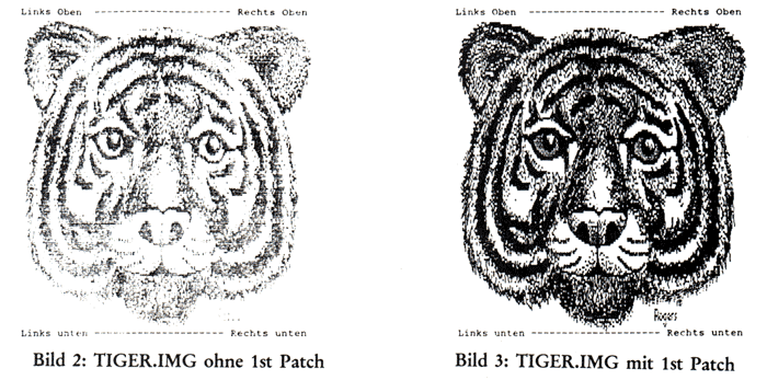 TrĂ€gt man dieser Tatsache keine Rechnung, erscheint der mitgelieferte Demo-Tiger zwar in hervorragender BriefqualitĂ€t; es drĂ€ngt sich jedoch der Eindruck auf, als hĂ€tte er seinen Kopf versehentlich auf einer Dampframme abgelegt... 1st Patch behebt diesen MiĂstand dadurch, daĂ jede Pixelspalte doppelt und jede vierte dreifach ausgegeben wird. Ergebnis: Der Tiger packtâs wieder.